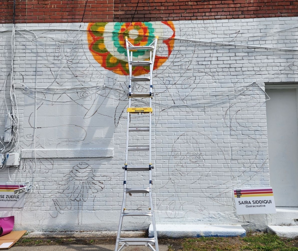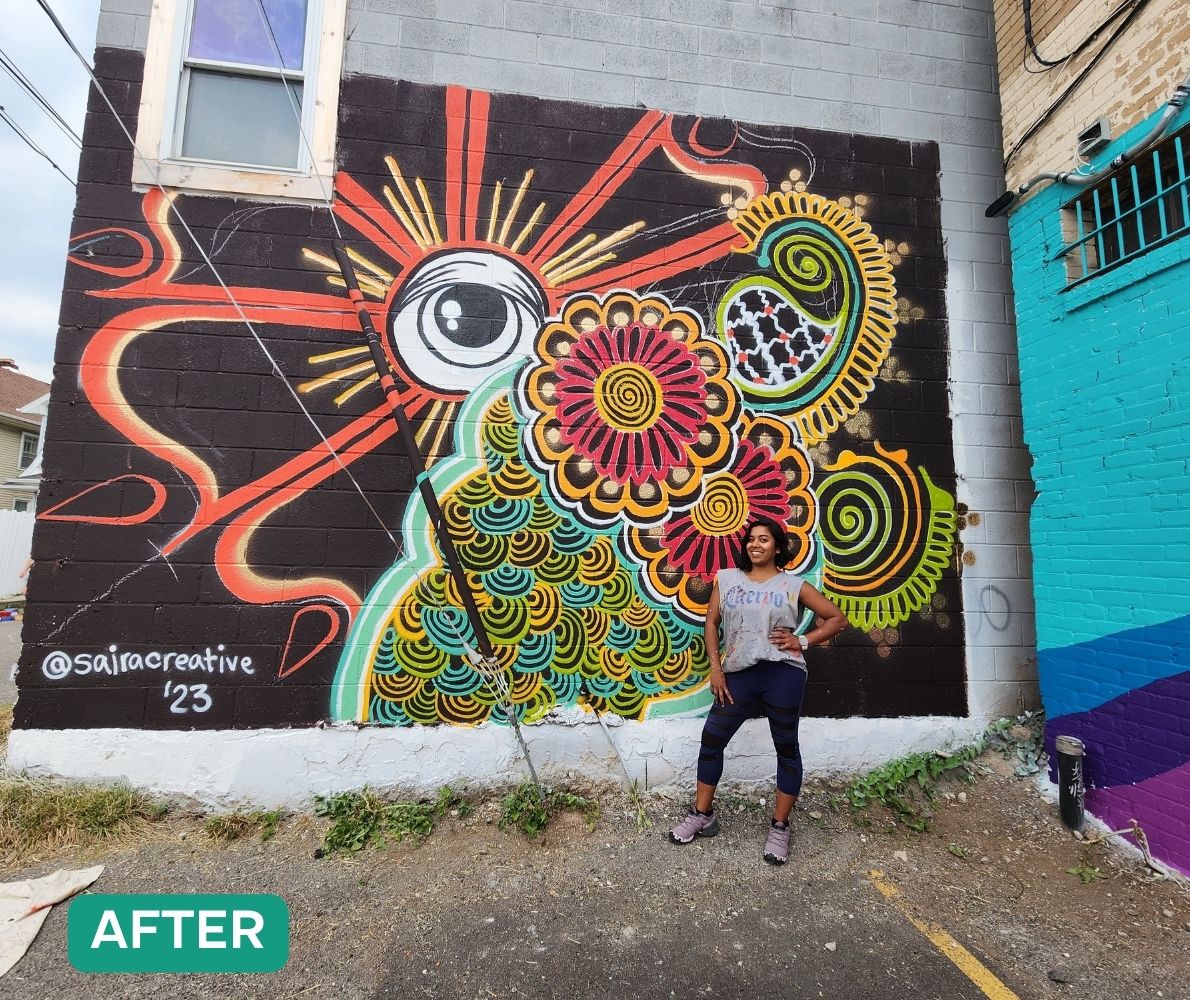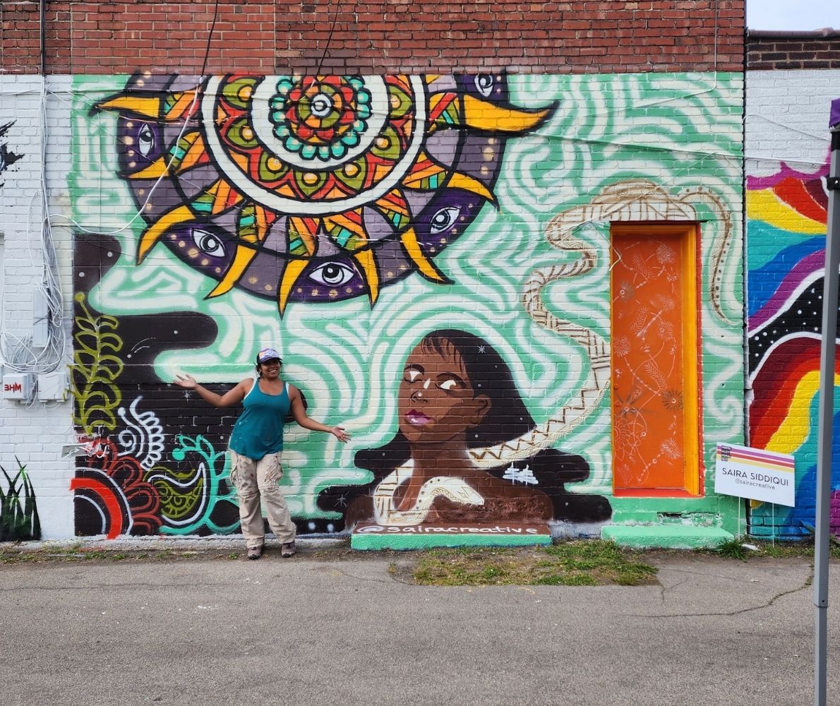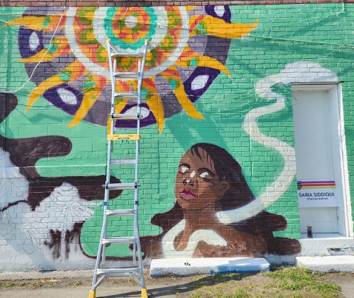 Saira was one of 26 mural artists for the Hertel Alley Mural Fest (2023). She was selected out of 100+ applicants for the event due to her unique artistic style and community-centered approach. All artists were asked to create a design unique to them and within their niche placement within the alley – Saira did not disappoint! We highly recommend her for her artistic ingenuity and professionalism when it comes to community based creative place making! We can’t wait to work with her again.